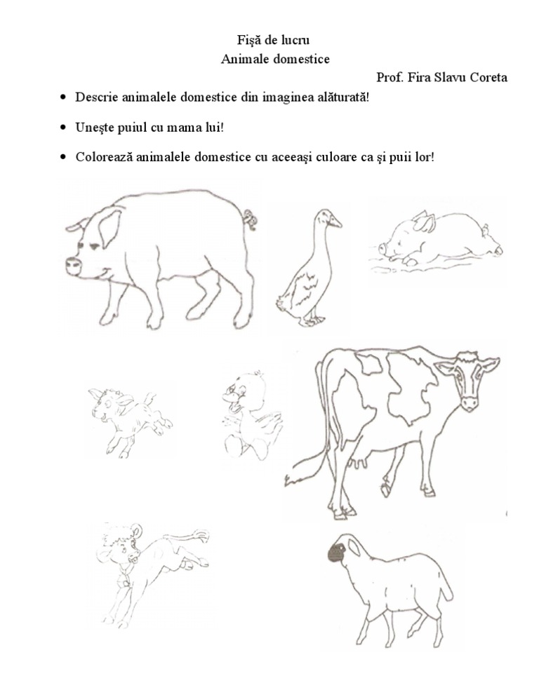 Iar pentru ca noi oamenii facnd parte din aceeasi planeta alaturi de animale si vietuitoare, trebuie sa cunoastem in cel mai mic detaliu fiecare specie. Fisele sunt usor de realizat mai ales cu indrumarea dvs. Animalele și puii lor animalele si puii lor, denumiri de animale si a puilor lor. 0 evaluări0% au considerat acest document util (0 voturi). Numr i coloreaz animalele domestice.